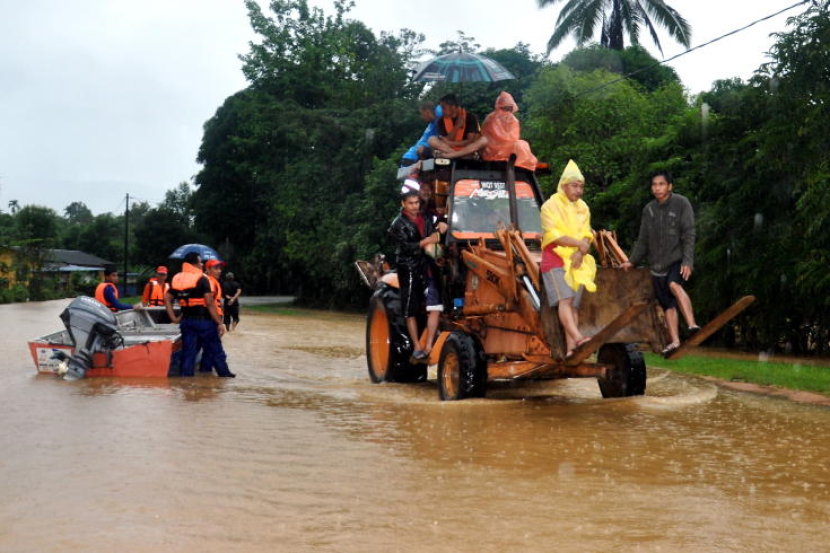 Penduduk Kampung Lubuk Periuk menggunakan jentera berat untuk berulang alik dari rumah mereka ke pusat pemindahan ekoran banjir yang melanda kampung itu pada 3 Januari 2017. - BERNAMA