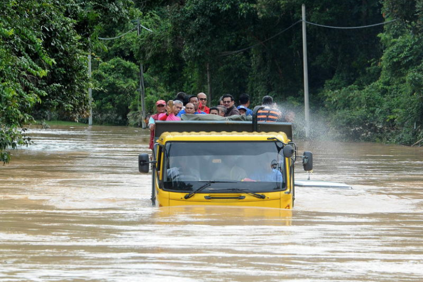 Mangsa banjir menggunakan lori untuk melalui jalan Keruak-Jerteh di Kampung Bekuk selepas jalan itu ditutup kepada kenderaan ringan setelah ditenggelami banjir pada 4 Januari 2017. - BERNAMA