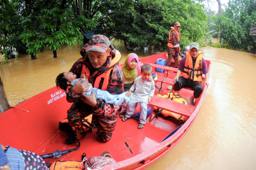 Anggota Bomba dan Penyelamat mendukung seorang kanak-kanak di dalam bot untuk dibawa ke pusat pemindahan selepas beberapa buah rumah di Kampung Kuala Ping dinaiki air banjir pada 31 Disember 2016. - BERNAMA