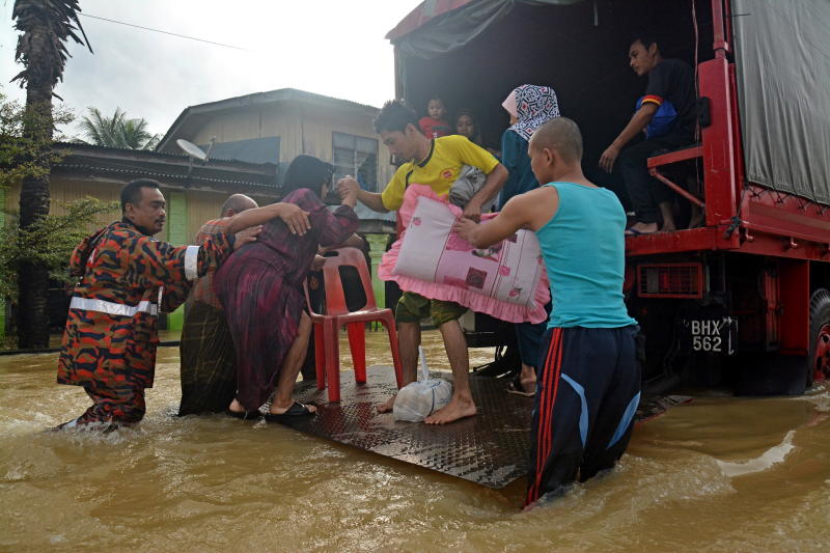 Anggota Bomba dan Penyelamat memindahkan mangsa banjir menggunakan trak di Kampung Kubang Rambutan pada 4 Januari 2017. - BERNAMA
