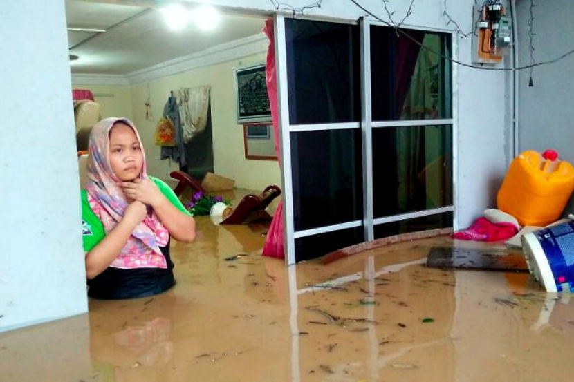 Seorang penduduk Kampung Pirasan meredah banjir dalam rumahnya yang teruk dilanda banjir kilat berikutan hujan berterusan sepanjang 27 Disember 2016. - BERNAMA