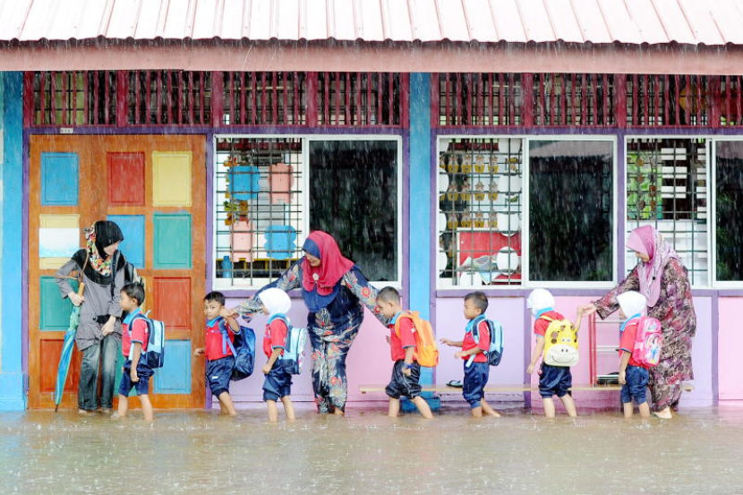 Guru-guru Sekolah Kebangsaan Sungai Ular memindahkan murid-murid prasekolah apabila sekolah itu dinaiki air banjir pada hari pertama persekolahan sesi 2017 pada 3 Januari 2017. - BERNAMA