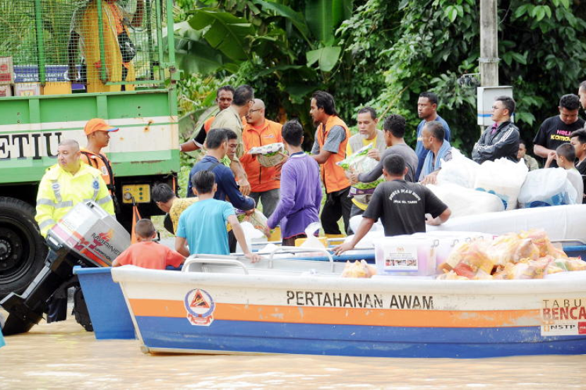 Penduduk kampung membantu memuatkan bekalan makanan ke dalam bot Angkatan Pertahanan Awam (APM) untuk dihantar ke pusat pemindahan mangsa banjir di Kampung Tasek pada 4 Januari 2017. - BERNAMA