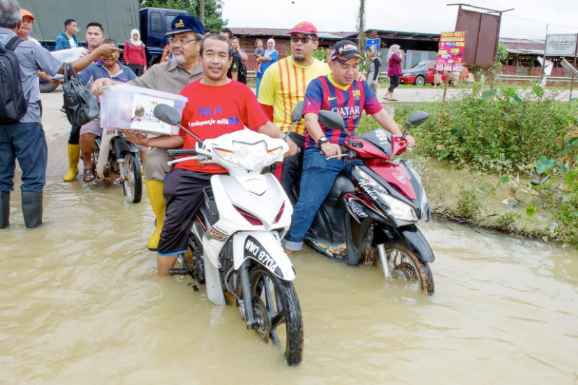 Timbalan Menteri Pertanian, Industri dan Asas Tani Datuk Seri Tajuddin Ab Rahman (kiri) membonceng motosikal ketika hadir menyampaikan sumbangan kepada mangsa banjir di Kampung Jeram Perdah hari 4 Januari 2017. Turut kelihatan Pengerusi Lembaga Kemajuan Pertanian Kemubu (KADA) Datuk Md Alwi Che Ahmad (dua,kanan).- BERNAMA