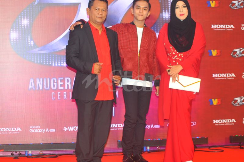 Aiman Tino (tengah) bersama ibu dan bapanya pada karpet merah, Anugerah Juara Lagu ke 31 (AJL31) yang diadakan di Pusat Dagangan Dunia Putra (PWTC) pada 22 Januari 2017. FOTO: HAFIS IDZLA