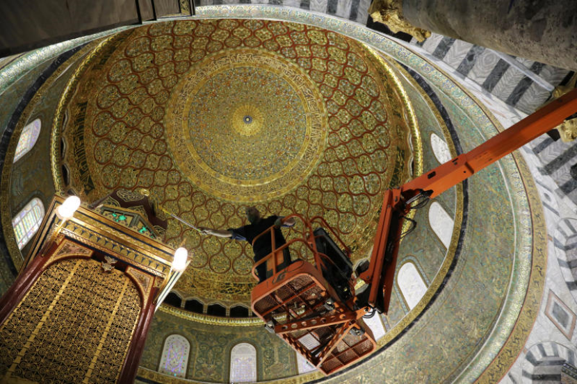 Petugas Wakaf Jordan membersihkan siling masjid di Baitulmuqqadis sebelum memulakan ibadat puasa.