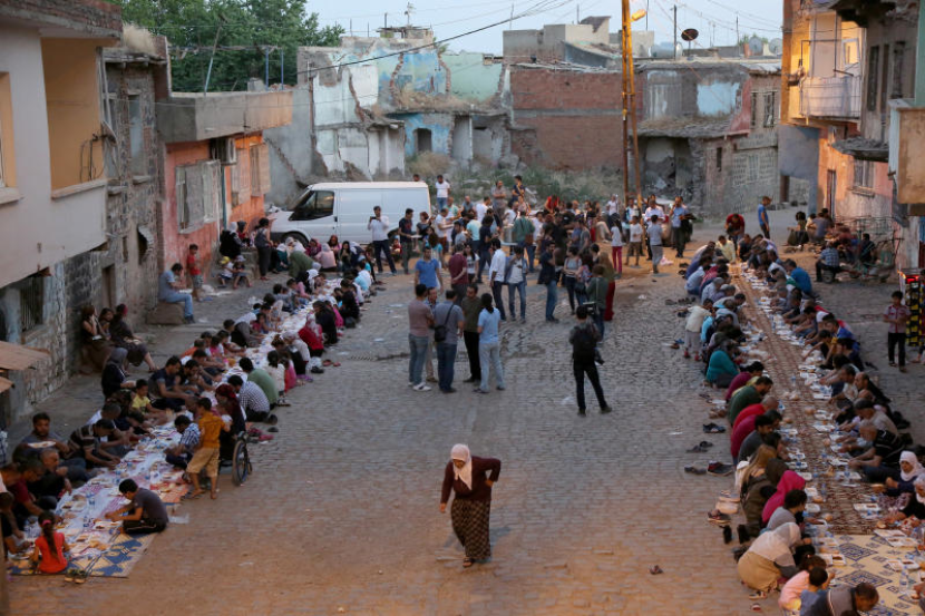 Umat Islam berkumpul untuk berbuka puasa di daerah Sur, Diyarbakir, Turki.