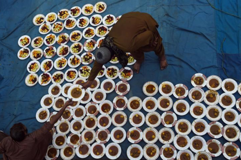 Sukarelawan dalam kalangan umat Islam Pakistan menyiapkan hidangan berbuka puasa di sekitar Lahore.