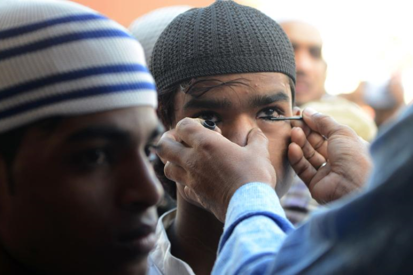 Penduduk Islam Nepal memakai celak bagi meraikan Aidilfitri di Masjid Kashmiri, Kathmandu baru-baru ini.AFP PHOTO / PRAKASH MATHEMA