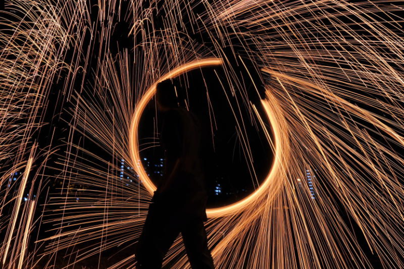 Seorang penduduk, Mohd Rahimi Rashid leka bermain bunga api berus periuk pada tinjauan fotoBERNAMA menjelang 1 Syawal di Kampung Baiduri baru-baru ini.