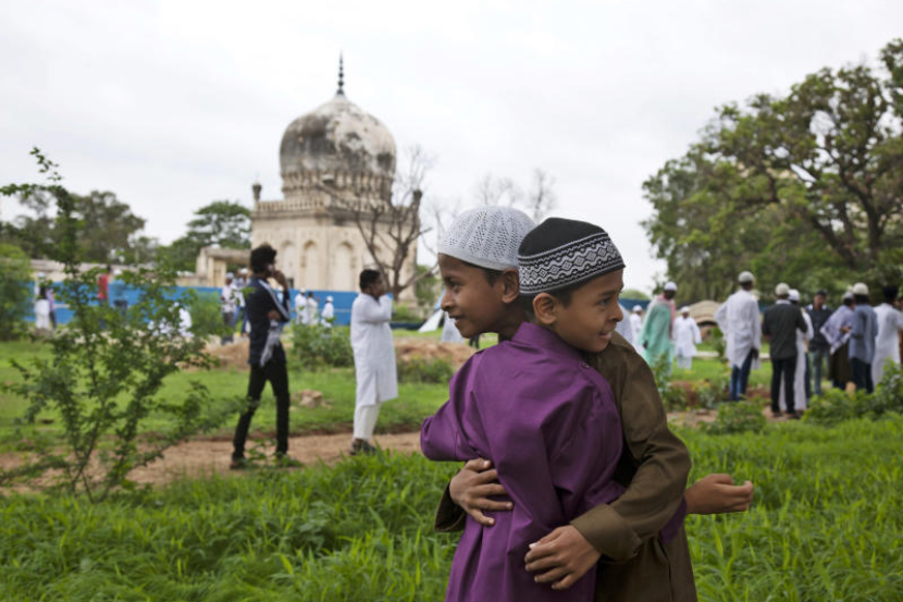 Kanak-kanak India Muslim berpelukan selepas menunaikan solat sunat Aidilfitri di Hyderabad, India baru-baru ini. (AP Photo/Mahesh Kumar A.)