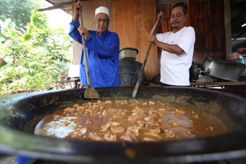 Ghazali Bakar, 50, (kiri) bersama saudaranya Sohi Maat, 53, memasak opor daging yang merupakan juadah istimewa untuk dihidangkan pada hari lebaran semasa tinjauan fotoBernama di Kampung Ubai, baru-baru ini.