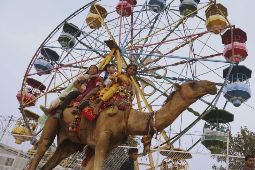 Kanak-kanak Pakistan gembira menunggang unta ketika berkunjung bersama keluarga ke karnival di tebing Sungai Ravi bagi meraikan Aidilfitri di Lahore. (AP Photo/K.M. Chaudary)