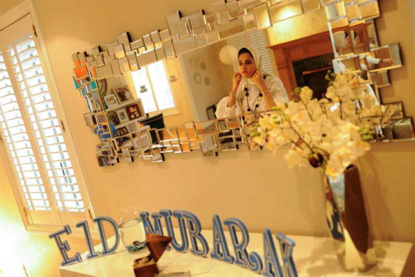 Warga Yaman-Amerika beragama Islam, Hajar Udayni membetulkan tudungnya ketika bersiap untuk meraikan Aidilfitri di kediamannya di Brooklyn, New York. REUTERS/Kholood Eid