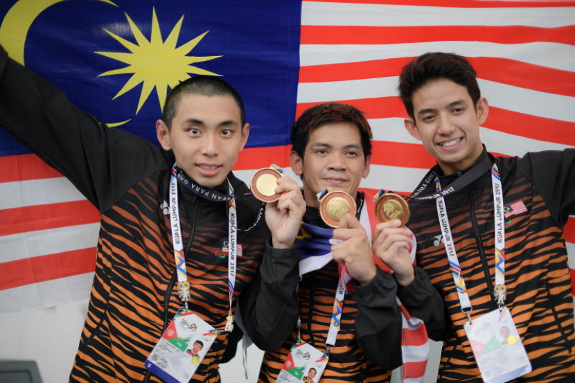 Tiga atlet renang negara yang mendapat pingat emas dalam acara renang iaitu Jamery Siga (tengah) dalam acara 200m kelas S5, Chung Wei Yong (kiri) dalam acara kuak kupu-kupu 50m dan Anas Zul Amirul Sidi dalam acara renang gaya bebas 100m kelas S14 sempena Sukan Para ASEAN ke-9 Kuala Lumpur 2017 di Pusat Akuatik Negara Bukit Jalil. -fotoBERNAMA