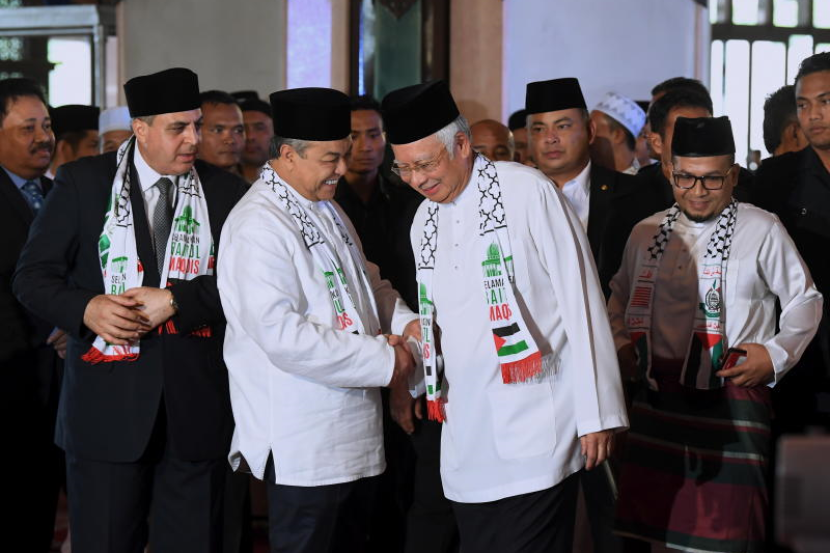 Perdana Menteri Datuk Seri Najib Tun Razak disambut oleh Timbalannya, Datuk Seri Dr Ahmad Zahid Hamidi pada Solat Jumaat dan Solat Hajat serta Himpunan Solidariti Selamatkan Baitulmaqdis di dewan solat utama Masjid Putra. - Bernama