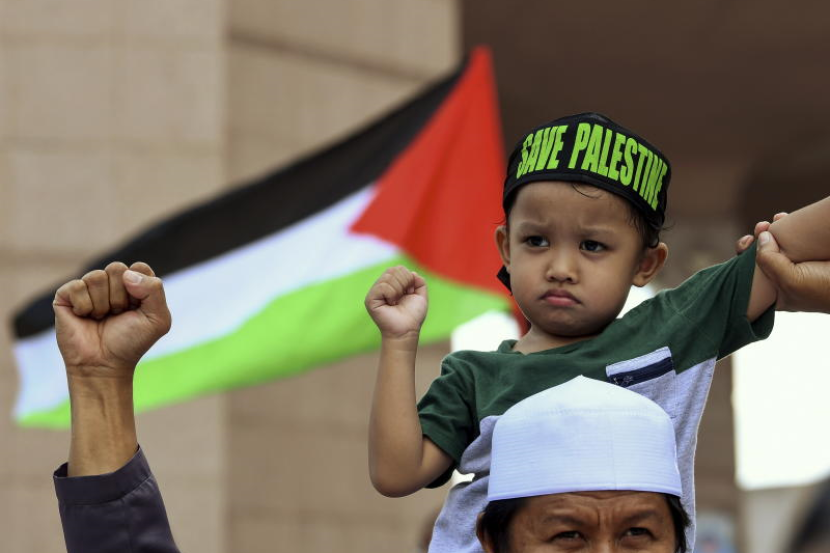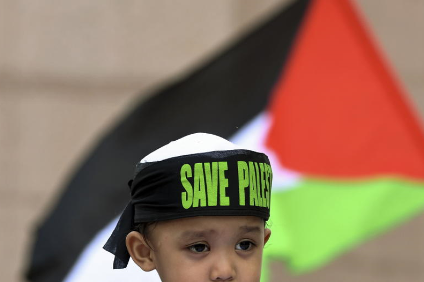 Seorang kanak-kanak memakai kain lilit dikepalanya yang memaparkan perkataan 'Save Palestin' pada Himpunan Putih Solidariti Selamatkan Baitulmaqdis di Masjid Putrajaya. - Bernama
