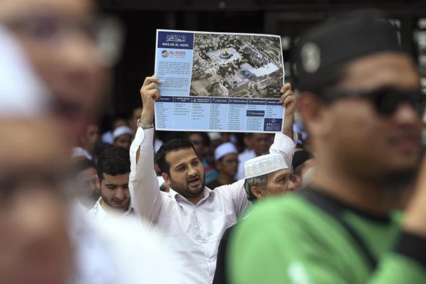 Seorang rakyat Palestin mengangkat gambar Masjid Baitulmqdis pada Himpunan Putih Solidariti Selamatkan Baitulmaqdis di Masjid Putrajaya. - Bernama