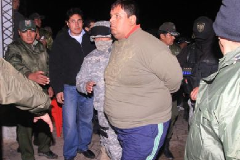 Salah seorang tahanan yang terlibat dalam pergaduhan di penjara Palmasola, timur Bolivia diiringi polis.