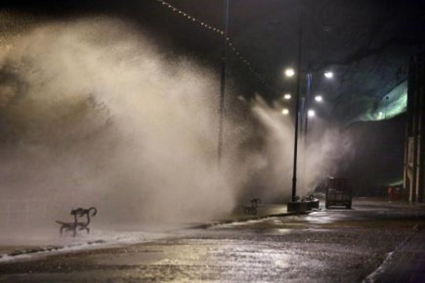 Ombak kuat hingga memecahkan tembok laut ketika air pasang di Aberystwyth, barat Wales. -foto/AFP