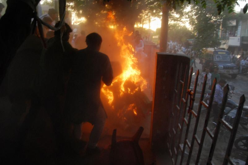 Ketika perdebatan itu sedang berlangsung, seorang lelaki yang kemudiannya dikenalpasti oleh polis sebagai Durgesh Kumar Singh, muncul dari tengah-tengah khalayak ramai lalu naik ke atas pentas dan mencurahkan dirinya dengan petrol sebelum dia menyalakan api sehingga menyebabkan seluruh badannya dimamah api dan selepas itu meluru ke arah seorang pemimpin dari Parti Bahujan Samaj, bernama Kamruzzama Fauji, lalu mendakapnya erat.