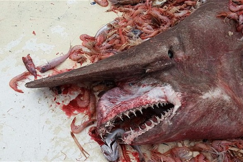 Berwarna merah jambu gelap, nelayan itu terkejut apabila pukat udangnya turut diselit dengan jerung zaman purba itu.
