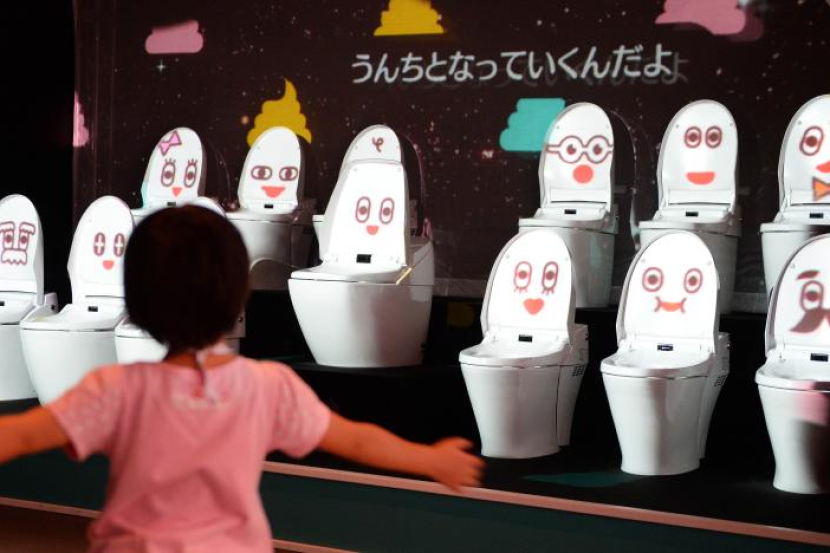 Kanak-kanak yang memakai topi berbentuk bahan buangan teruja menaiki gelongsor tandas gergasi untuk ke bilik air yang dibina dengan ukuran lima meter (16 kaki) tinggi, sempena pameran 'Journey of Poo' (perjalanan bahan buangan) di Muzium Negara Sains Baharu dan Inovasi.