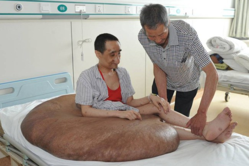 TUMOR terbesar di dunia telah berjaya dikeluarkan daripada badan seorang lelaki melalui pembedahan. Yang Jianbin, 37, dari China, dilahirkan dengan tanda lahir di belakang yang lama-kelamaan membesar kepada ketumbuhan seberat 110kg, dua pertiga daripada berat badannya. Ketumbuhan yang begitu besar itu menyebabkan Yang hanya dapat berbaring atau duduk di atas katil sepanjang hari. Keadaan perubatan itu dipanggil 'neurofibromatosis' yang merupakan satu gangguan genetik yang menjejaskan pertumbuhan normal tisu sel. Dia menjalani pembedahan pertama apabila dia berusia 12 tahun di mana pada masa itu tumornya telah membesar kepada saiz genggaman. Ketua pakar bedah Chen Minliang berkata: "Kami telah melihat pesakit neurofibromatosis sebelum ini, tetapi ini adalah tumor saraf terbesar yang kami pernah kami lihat." Yang telah ditempatkan di dua buah katil hospital semasa pembedahan yang berjalan selama 16 jam. Dia telah diberikan 5,000 ml darah, yang merupakan jumlah darah yang lebih daripada jumlah keseluruhan badan orang dewasa.