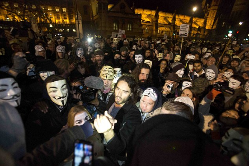 Sebahagian besar para demonstrator memakai topeng Guy Fawkes - watak yang menjadi popular dalam filem "V for Vendetta".