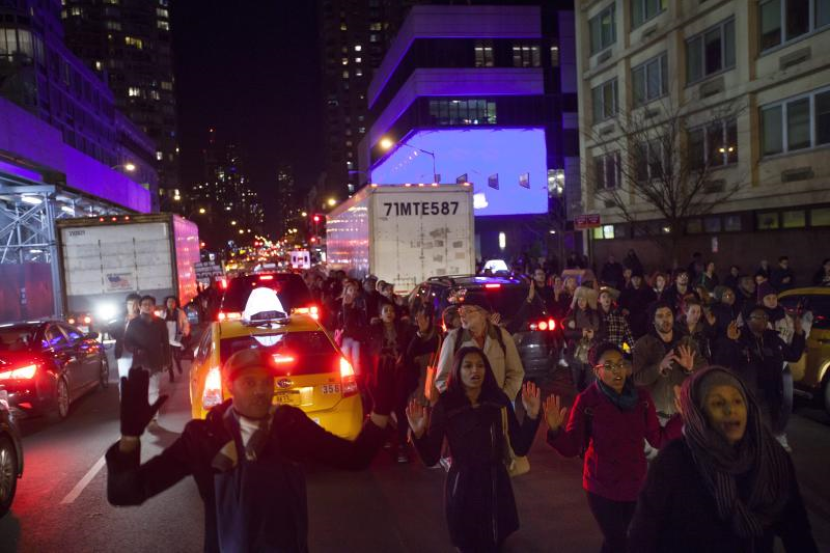 Dalam kejadian terbaru ini, beribu orang telah keluar berarak dari Pusat Rockefeller di tengah-tengah bandar raya ini dan juga di hadapan pusat tumpuan pelancong iaitu Dataran Times (Times Square) sambil menjerit “No justice, no peace,” (tiada keadilan, tiada keamanan).