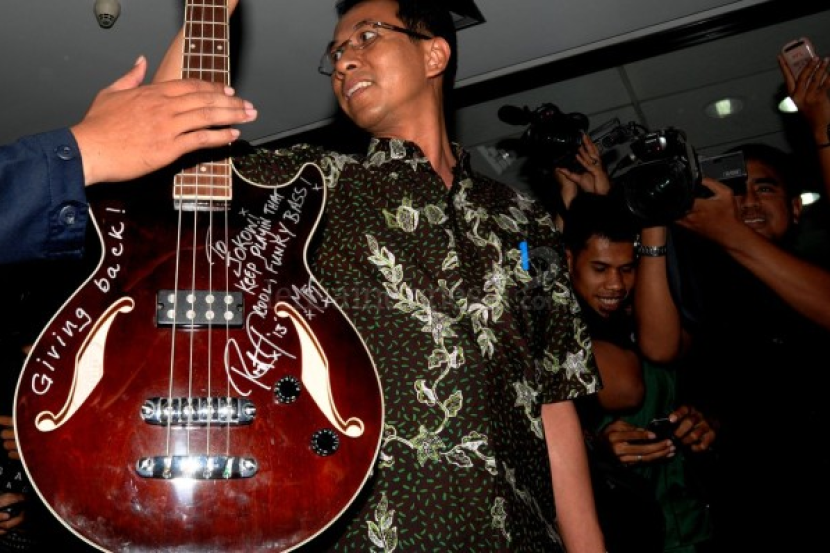 Jokowi menerima hadiah gitar siap bertanda tangan Trujillo ketika masih berkhidmat sebagai Gabenor Jakarata.