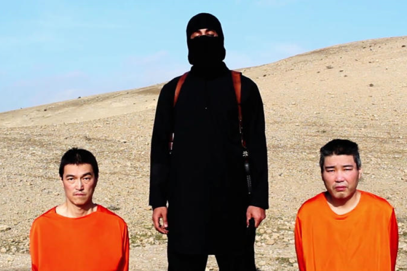 Imej yang diambil daripada video dalam talian yang dikeluarkan oleh kumpulan IS pada Selasa. Rakaman itu menunjukkan kumpulan itu mengancam untuk membunuh dua tebusan Jepun yang dikenal pasti sebagai Kenji Goto (kiri) dan Haruna Yukawa (kanan).