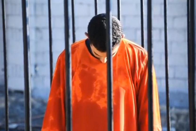 Dia dibakar dalam sebuah sangkar besi sementara beberapa anggota IS yang memakai topeng dilihat berdiri berhampiran dengannya.
