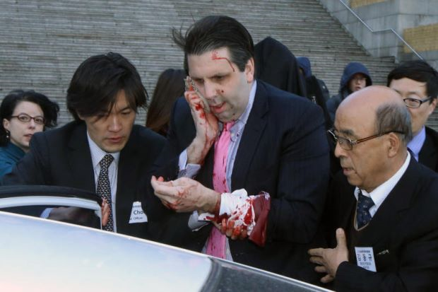 Penyerang yang dilaporkan melaungkan slogan anti peperangan ketika membuat serangan ke atas Lippert yang baharu sahaja memegang jawatan tersebut di Seoul pada Oktober tahun lalu, telah ditahan serta-merta.