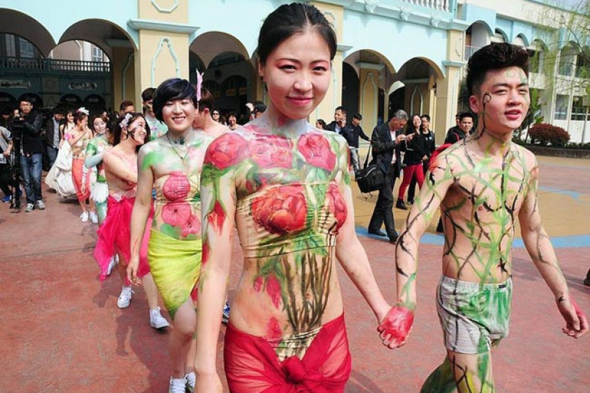 SEPULUH pasangan menyertai majlis perkahwinan dengan hanya memakai pakaian dalam dan 'menutupi' badan dengan pelbagai lukisan berwarna-warni.