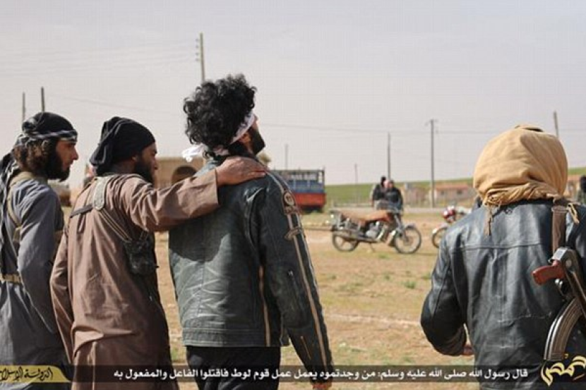 Dalam gambar terbaru yang dimuat naik IS ke laman sosial, terdapat empat lelaki dipercayai ahli kumpulan militan tersebut membawa dua lelaki gay yang telah ditutup mata mereka.