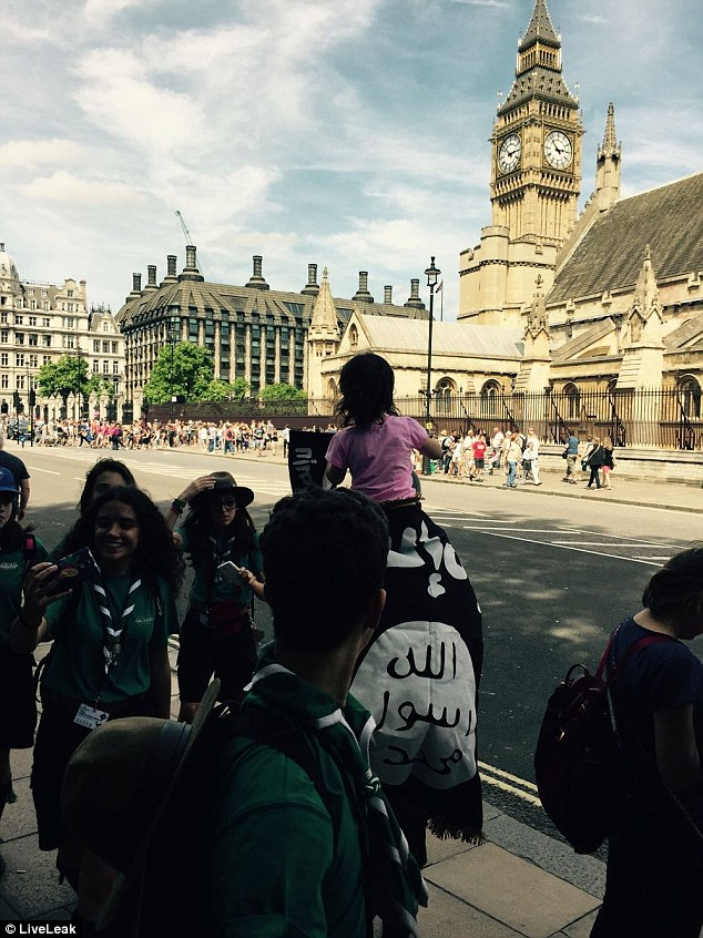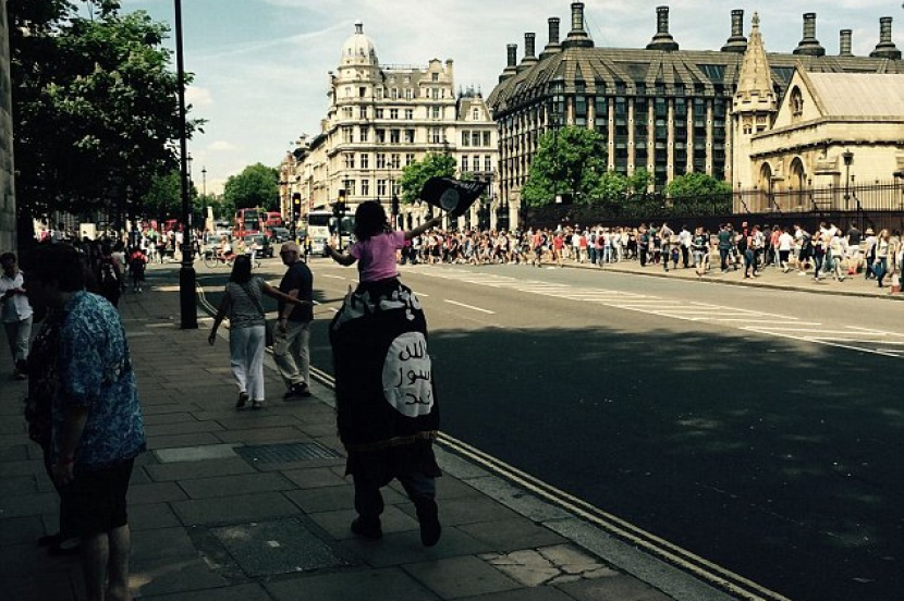 ORANG ramai termasuk pelancong yang berada di depan Parlimen British terkejut dan panik apabila seorang lelaki dan budak perempuan yang didukungnya membawa kain seperti bendera kumpulan Negara Islam (IS).