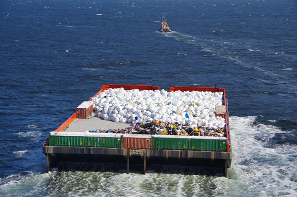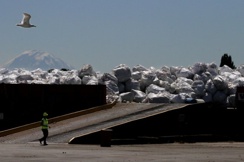 Sebuah tongkang dilihat penuh dengan muatan beg, timbunan pembungkus makanan, botol, alatan memancing, ribuan boya, pelampung dan serpihan lain tiba di Seattle pada Khamis lalu selepas mengangkut muatan pertama di Kodiak, Alaska.