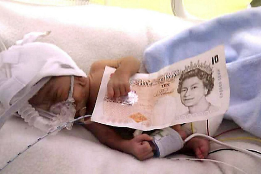 Kanak-kanak itu dilahirkan sebagai bayi pra-matang yang berusia lapan minggu dan membesar sehingga sebesar wang kertas ketika berusia 10 bulan.