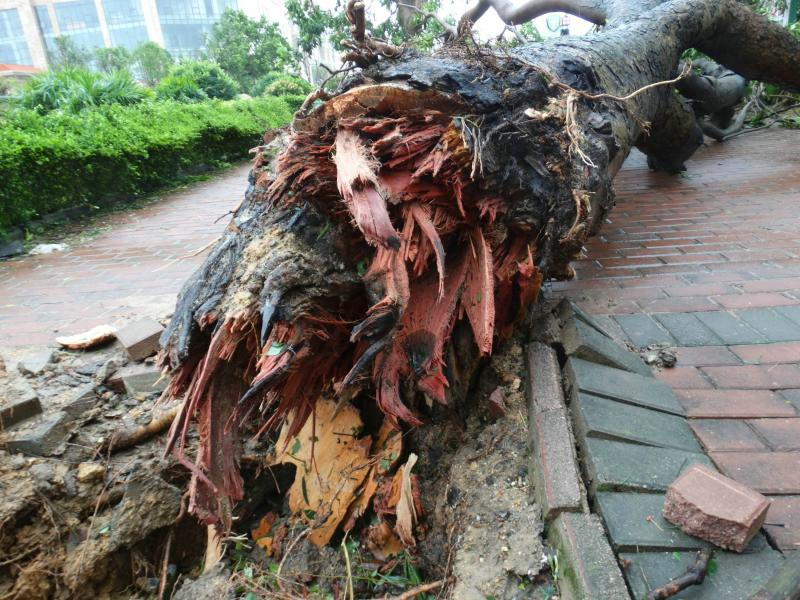 Rakaman televisyen menunjukkan pokok-pokok tumbang kesan taufan itu, manakala bangunan di tapak pembinaan musnah.