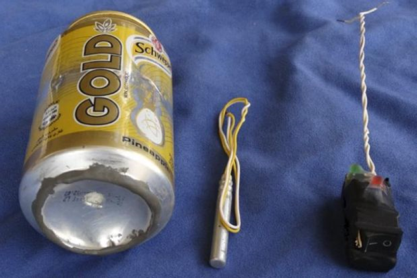 Gambar itu menunjukkan minuman tin Schweppes Gold yang menjadi bahan peledak dengan satu suis berwarna biru pekat serta tiga komponen ringkas yang didakwa menjatuhkan pesawat berkenaan.