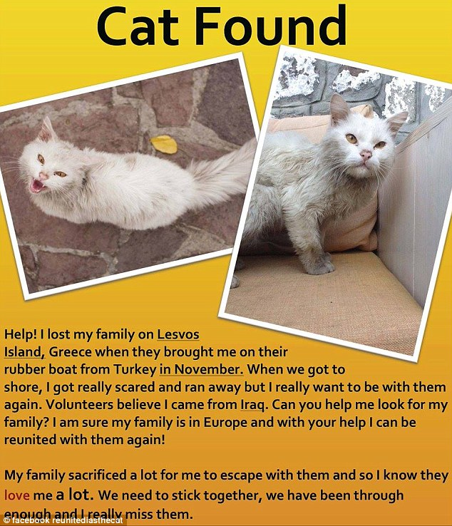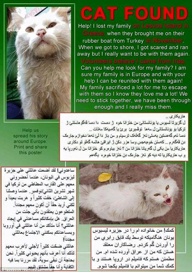 Sukarelawan Amerika, Ashley Anderson dan rakannya, Amy Shrodes dan Michelle Nhin menghasilkan poster dalam bahasa Inggeris dan Arab yang ditampal di sekitar Greece dan Berlin untuk menyatukan kucing dan keluarga pelarian itu.