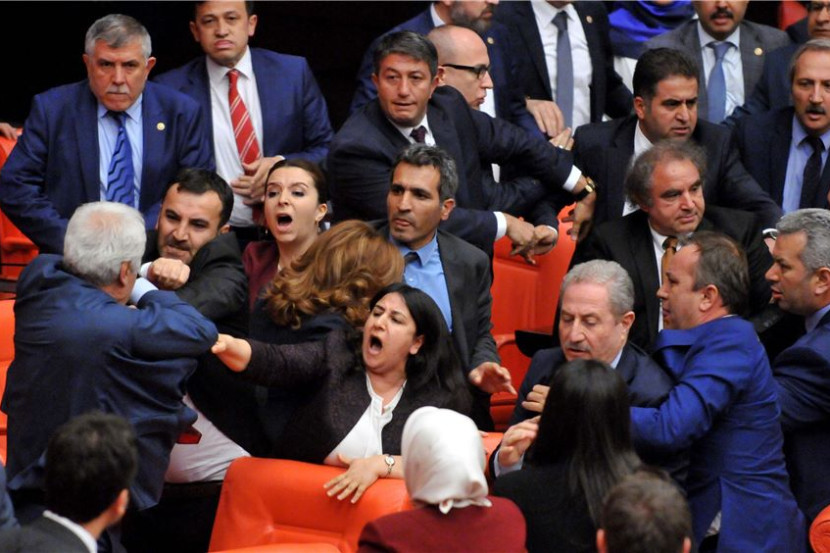 Rakaman televisyen menunjukkan pembuat dasar daripada parti Keadilan dan Pembangunan (AKP) dan Parti Demokrasi Rakyat (HDP) Kurdis bergaduh dalam bilik jawatankuasa selepas satu pertikaman lidah.