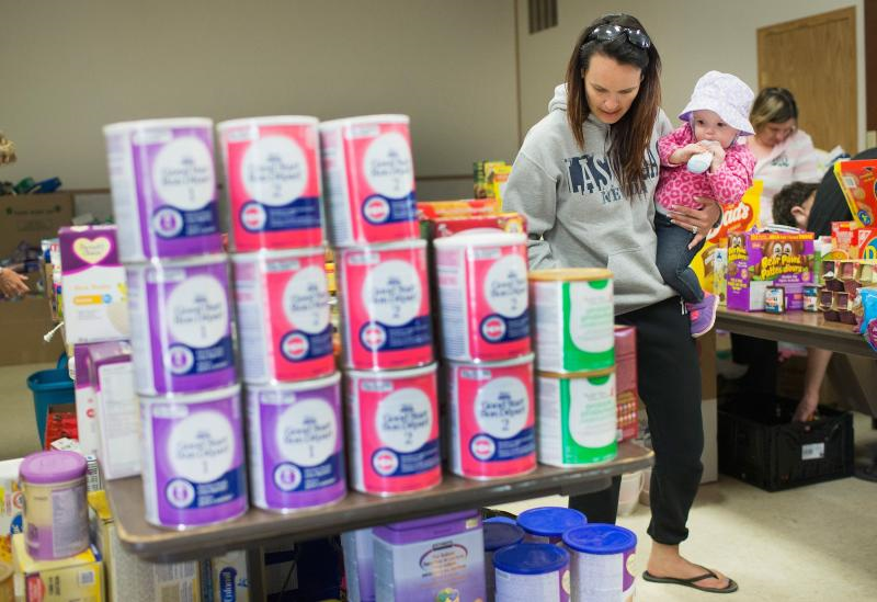Penduduk Alberta mendapatkan barang keperluan yang disediakan di pusat perpindahan mangsa kebakaran hutan.