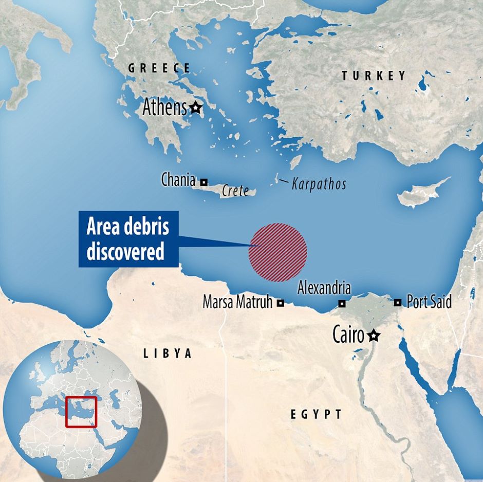 Menurut tentera Greece, serpihan pesawat Airbus A320 Penerbangan 804 yang membawa 66 orang termasuk 10 anak kapal ditemui oleh pasukan mencari dan penyelamat (SAR) dilihat terapung di lautan, kira-kira 370 kilometer dari selatan Pulau Crete.