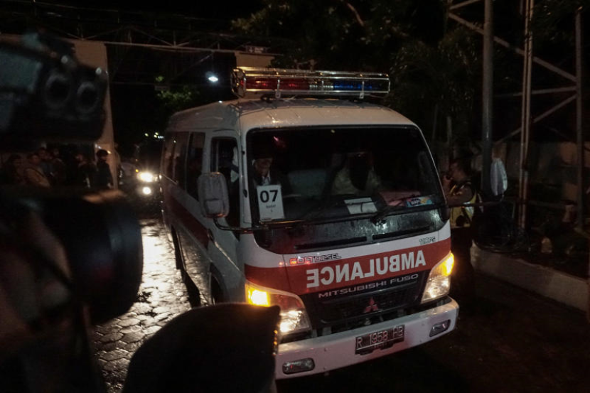 Konvoi 17 ambulans, kebanyakannya membawa keranda, tiba pagi Khamis di bandar paling hampir dengan Nusa Kambangan. - AP