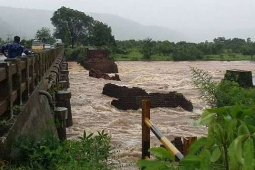 Rakaman televisyen menunjukkan sebuah jambatan besi berkonsepkan zaman kolonial British di sungai Savitri runtuh ketika hujan lebat.