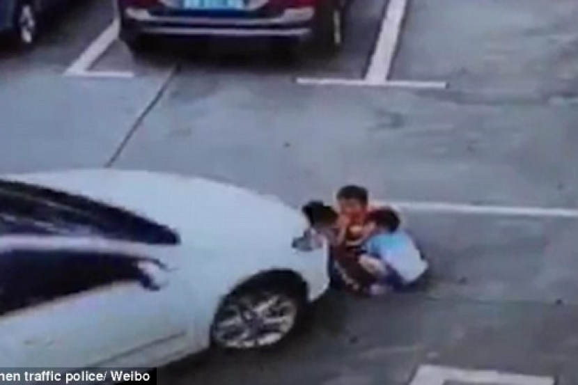 Turut kelihatan tangan seorang daripada kanak-kanak itu digilis tayar kereta sebelum pemandu wanita tersebut yang hanya dikenali sebagai Zeng menghentikan keretanya.