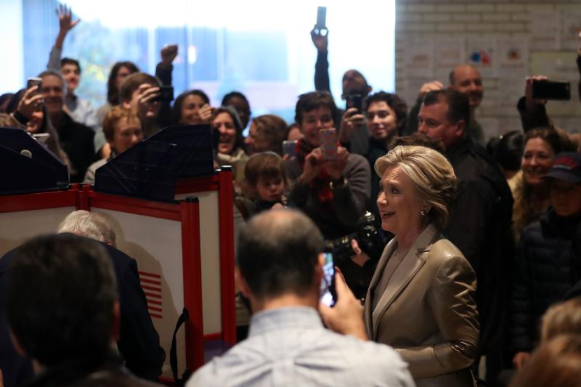 Seramai 150 penyokongnya bersorak ‘Puan Presiden’, menceriakan calon Demokrat itu yang turun mengundi bersama suaminya Bill Clinton di sebuah sekolah berhampiran rumah mereka di Chappaqua.