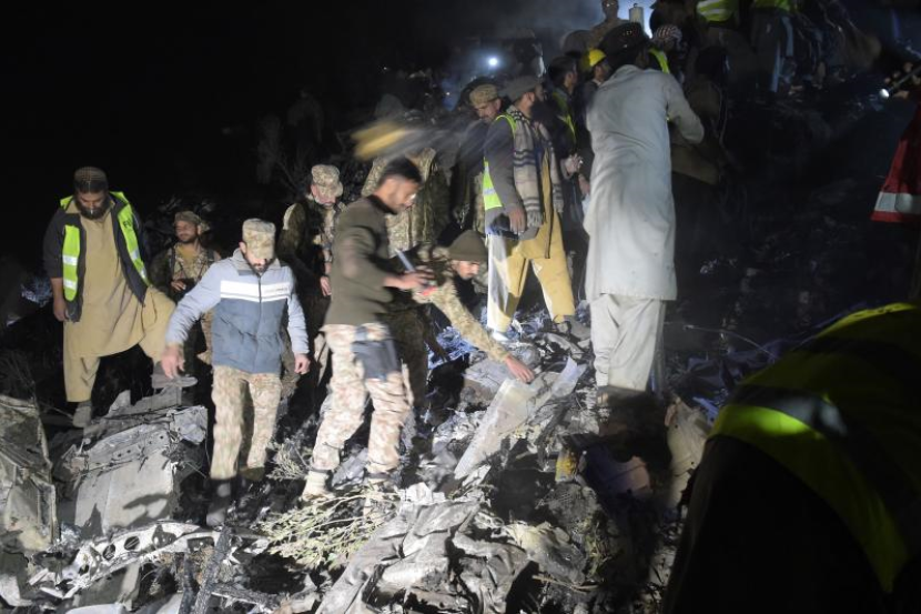 Pasukan penyelamat, termasuk ratusan penduduk kampung berusaha membawa keluar mayat dari bangkai pesawat, yang ditemui beberapa ratus meter dari daerah Abbottavad di wilayah Khyber Pakhtunkhwa.